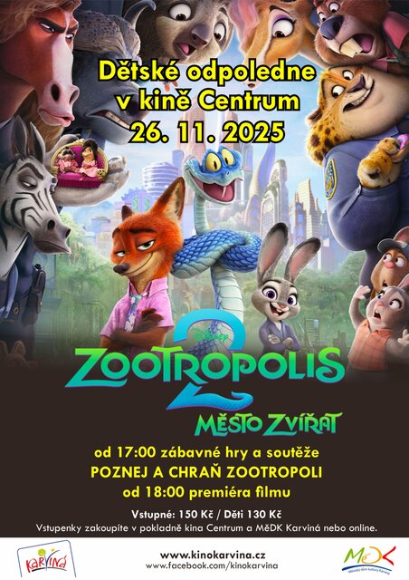 od 17:00 doprovodný program v prostorech kina Centrum - poznávací hry a soutěže "POZNEJ A CHRAŇ ZOOTROPOLI" (pro diváky s platnou vstupenkou na představení)